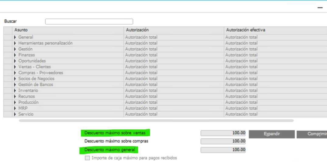 No consigo la autorización del usuario para que pueda hacer descuentos a nivel de la Linea del articulo. El que es general no es problema, pero el de la Linea no me permiten. Me podrian ayudar a ver donde se autoriza este descuento.