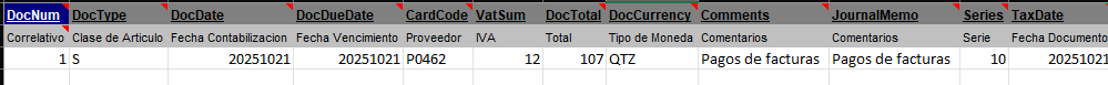 Buenas tardes a todos, tengo una inconvenientes que no he sido capas de solucionar, les comento que se necesita realizar la carga de facturas de proveedores a SAP, estoy utilizando las plantillas siguiente: