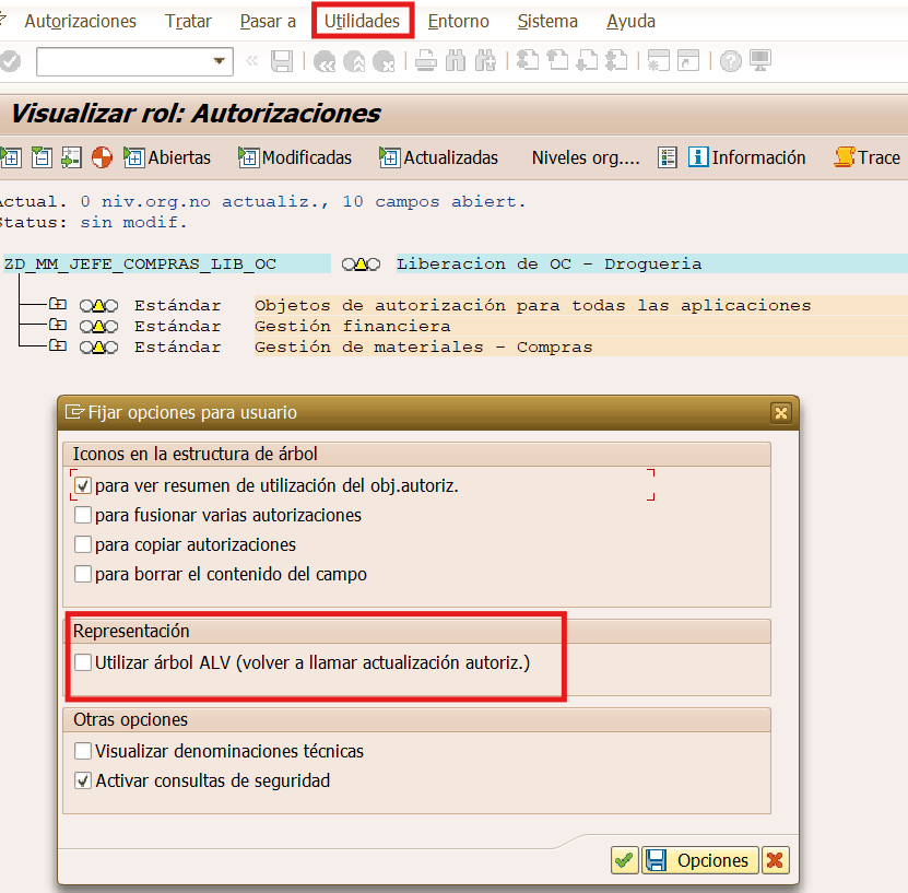 Dentro de Visualizar rol : Autorizaciones Utilidades > Parametrizaciones > Marcar/Desmarcar la vista de arbol ALV