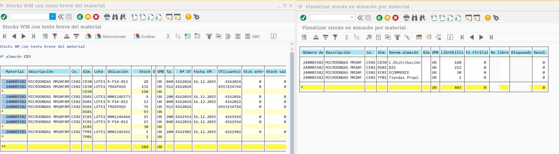 Estimado, crearon otro almacen (DS01)en el mismo centro, pero este en un principio no fue activado para ewm, se realizaron traspasos lo cual descontaba stock en el almacén madre, luego se habilito para ewm lo cual como se puede ver en la imagen muestra stock diferentes y negativos que no se pueden entrar, favor su ayuda ! Necesito saber si el nuevo almacén los materiales y mov estan correctos para wm.