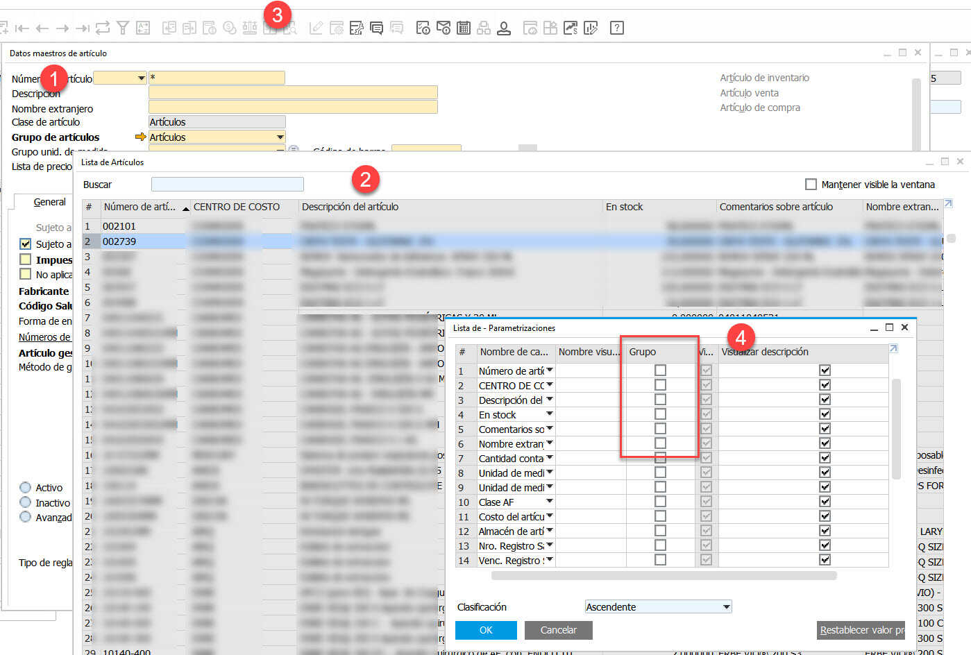 Podrías Verificar lo siguiente: al tener la vista de la Ficha de Datos Maestros de Articulos, puedes presionar el boton de Buscar y colocarle un * (Asterisco) y darle enter, allí se te deplegará la Lista Agrupada, en este momento podrás presionar el Boton de Parametrizaciones de Formularios (En el Menú de Iconos en la parte superior casi central) y alli buscarás la Columna Grupo que debe tener un casillero de Check, simplemente debes de Desmarcar el Check y listo.