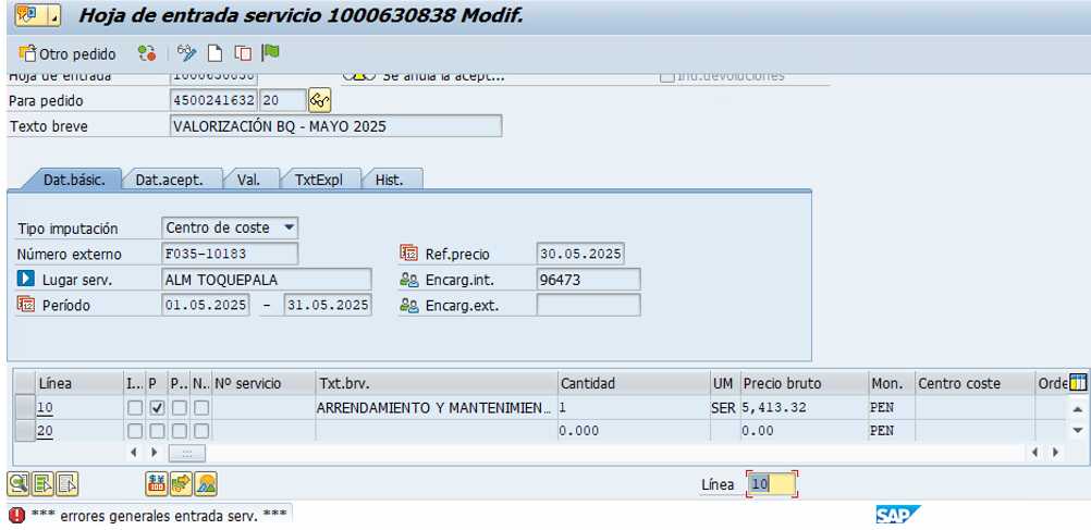 Hola, estamos presentando un error inusual. Al tratar de anular una HES genera este error: ***ERRORES GENERALES ENTRADA SERV.*** por alguna razón extraña, a pesar de tener el campo cuenta y centro de costo como obligatorio la HES se guardó sin imputación. Ahora no se puede revertir. Agradeceré su ayuda.