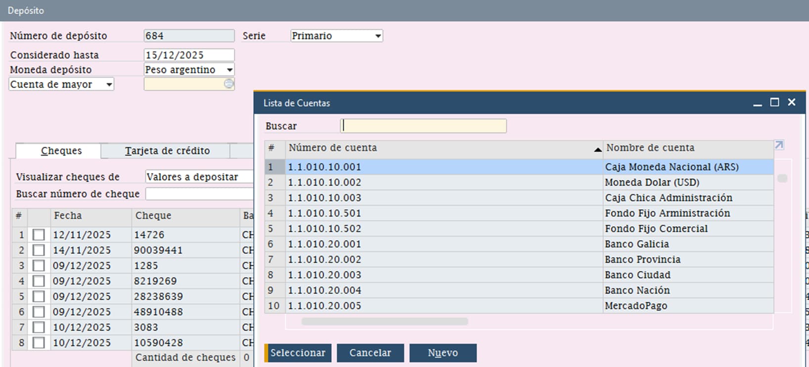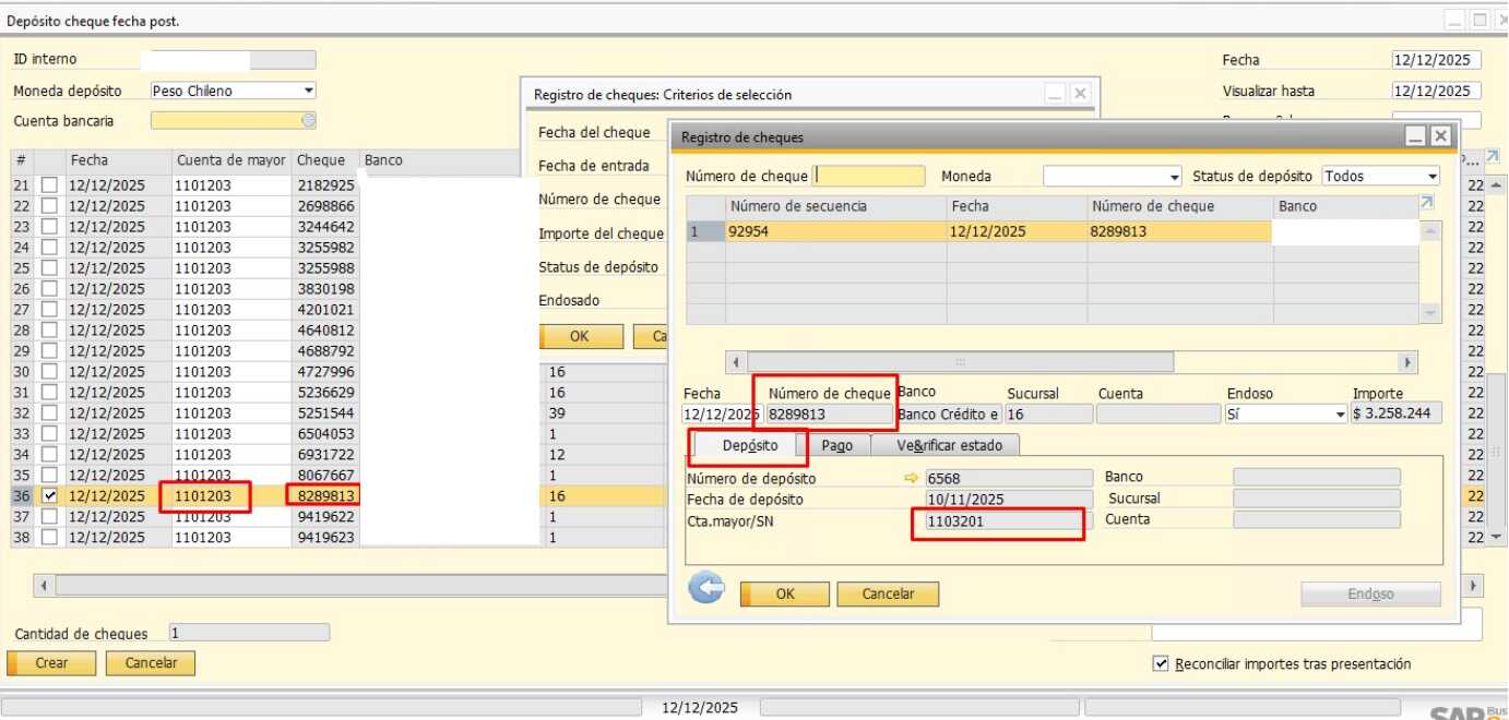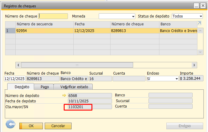 Tengo una consulta al momento de hacer el Deposito cheque fecha post, en la columna de cuenta de mayor me sale 1101203 y deberia salir 1103201 y no se las razones porque me esta saliendo con 1101203 es como si estuviera fija o predeterminada y no se donde la puedo cambiarla , observe un deposito de cheques el 8289813 y me sale la cuenta 1103201 ahora me da curiosidad que en la cuenta de mayor de deposito cheque fecha post me sale 1101203 , de ante mano para la persona que me pueda ayudar
