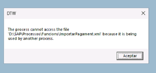 Este error en SAP Business One con DTW aparece porque el archivo .xml está siendo bloqueado por otro proceso al momento de la ejecución automatizada desde un .bat. Aunque el proceso continúa y funciona, podés evitar el mensaje con buenas prácticas como cerrar editores, excluir la carpeta del antivirus, agregar timeout en el script o usar una copia temporal del XML. Este tipo de automatización es habitual en procesos batch de integración o importación de datos en SAP B1.