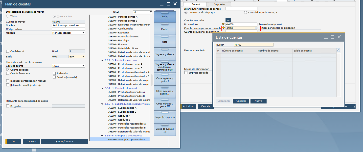 Para usar según creo que quieres usar … tienes que crear una cuenta 407001 normal y establecerla en Determinación de cuentas de mayor, además de en la ventana Finanzas del IC en Cuenta de compensación de anticipos… pero no en las asociadas, estas las usa en el pago.