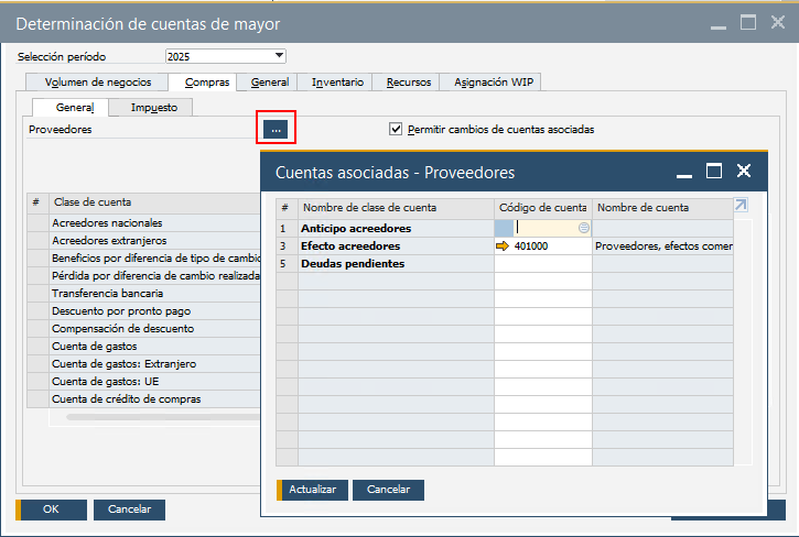 Seleccione una cuenta de mayor asociada para utilizar como predeterminada en los proveedores durante la creación de un pago efectuado basado en una factura de anticipo de acreedor.