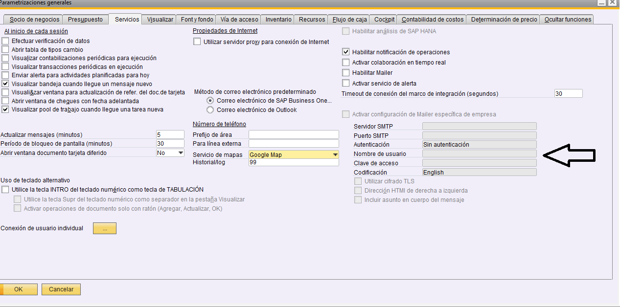 3-Define y programa las alarmas (Gestión → Gestión de alarma). Estas saltan en SAP cuando el usuario esta logueado. Si quieres activar las alarmas por correo, deberas activar el servicio de mailer. No recuerdo como activas el mailer en la version SQL de SAP (hace años me pase a HANA). Creo que esta en el service manager. Con eso creo que se te desbloquean los campos referentes al servidor de correos de la imagen que pusiste.