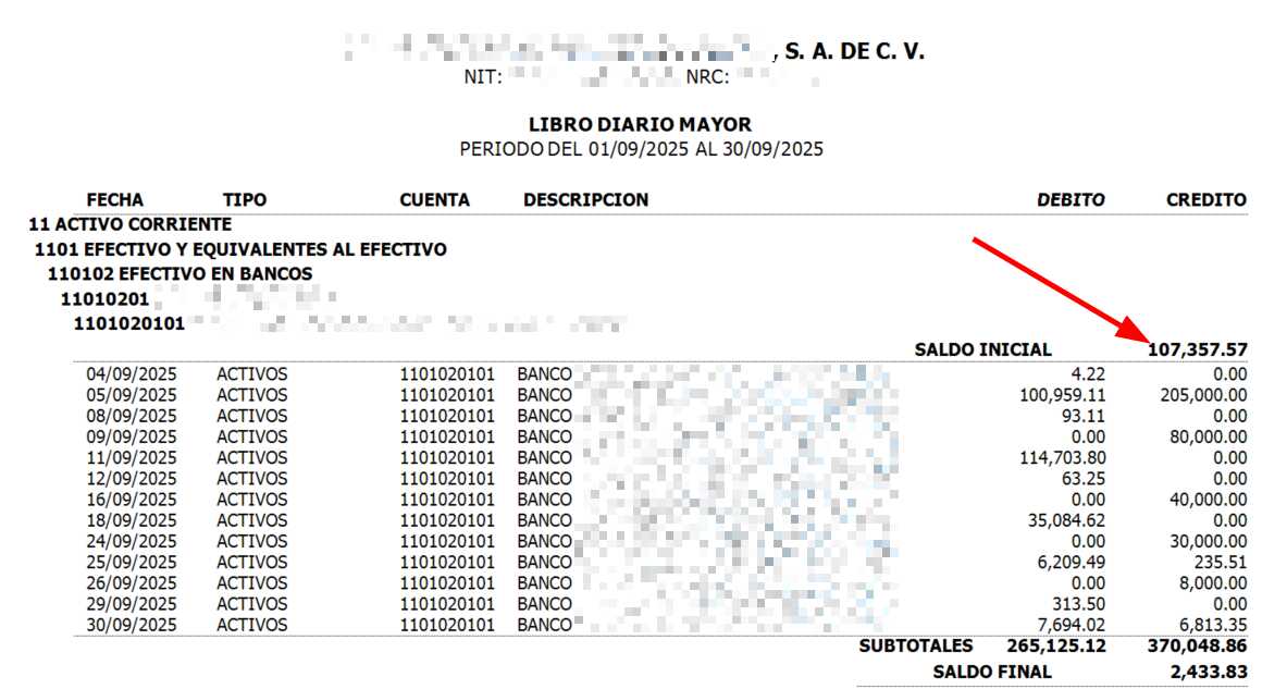 En este reporte, estoy yendo a traer el nombre de las cuentas contables, el numero de las cuentas, detallando el saldo diario por cuenta hasta el nivel 5, y a su vez, estoy sacando el saldo inicial.